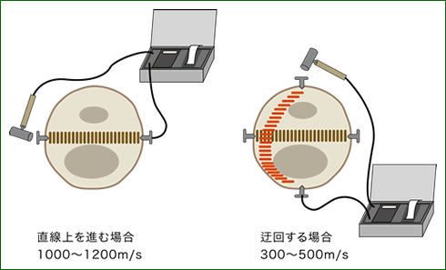 内部に腐朽や空洞がある場合、振動波は、材部を直線上で進めずに迂回するので、余計な時間がかかります。つまり、内部に材の欠陥があると低い値となり、欠陥がないと高い値となります。代表的な樹木について、健康な樹木の伝達速度がわかっています。これらを参考に、樹幹内部の腐朽や空洞の有無を推定することができます。