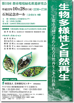 当財団は設立以来、都市緑化に関する各種事業や調査・研究を行っていますが、毎年「都市緑化月間」である10月に『都市環境緑化推進研究会』を開催しています。 平成22年度は、第33回「生物多様性と自然再生 −都市の緑において求められる自然再生とその技術−」を10月28日(木)に開催いたしました。