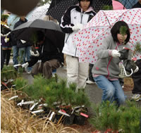 2月27日に高知県黒潮町入野の町有林で「子供の松原再生プロジェクト」が開かれ、町内9小学校の六年生ら130人が、卒業記念に松くい虫に抵抗力のあるクロマツ苗木550本を植樹しました。 |